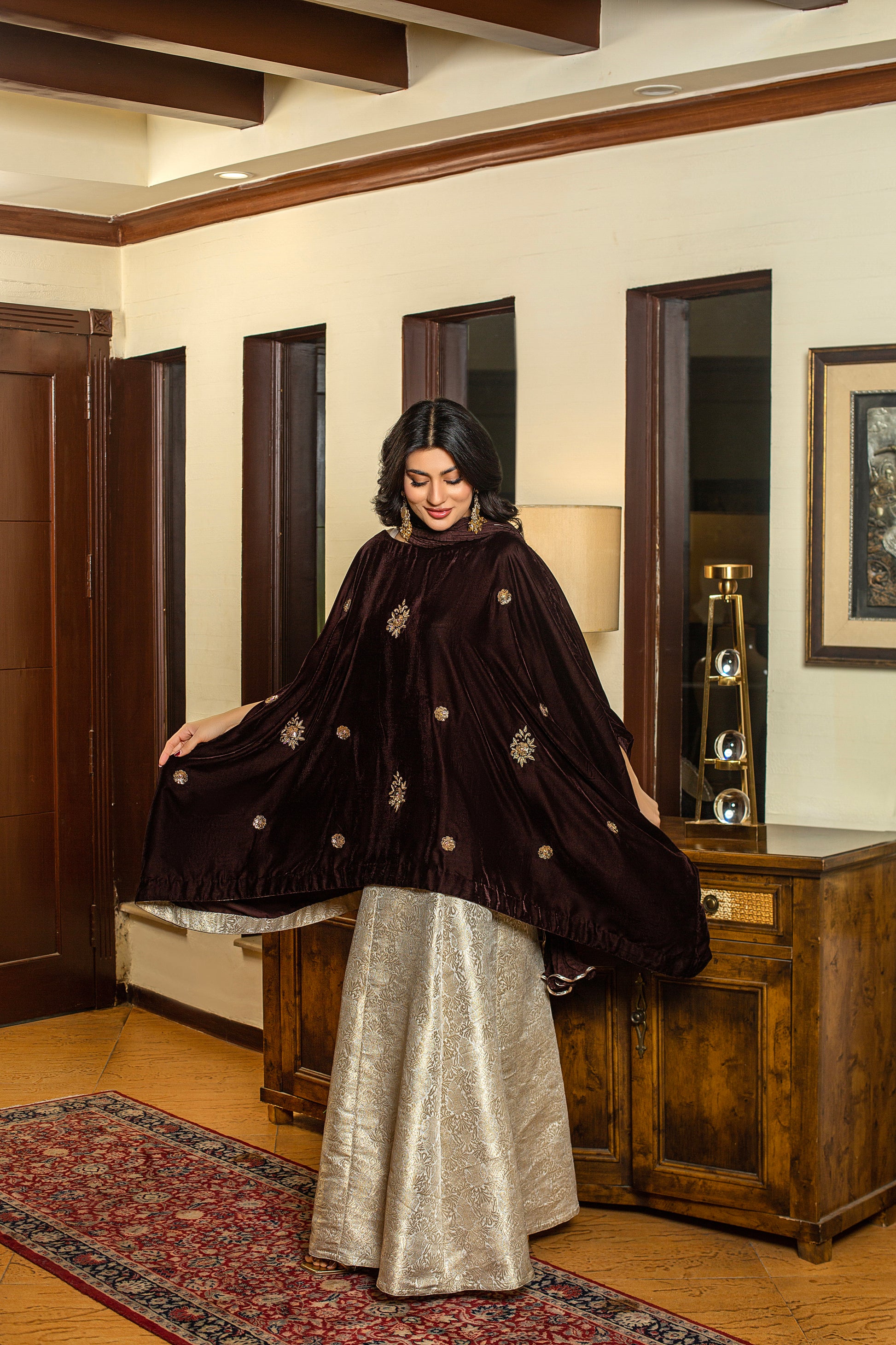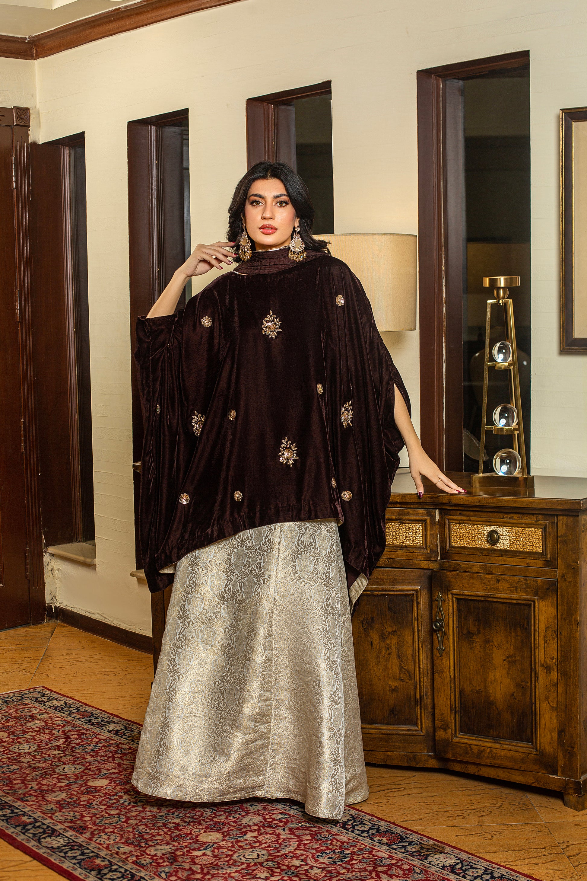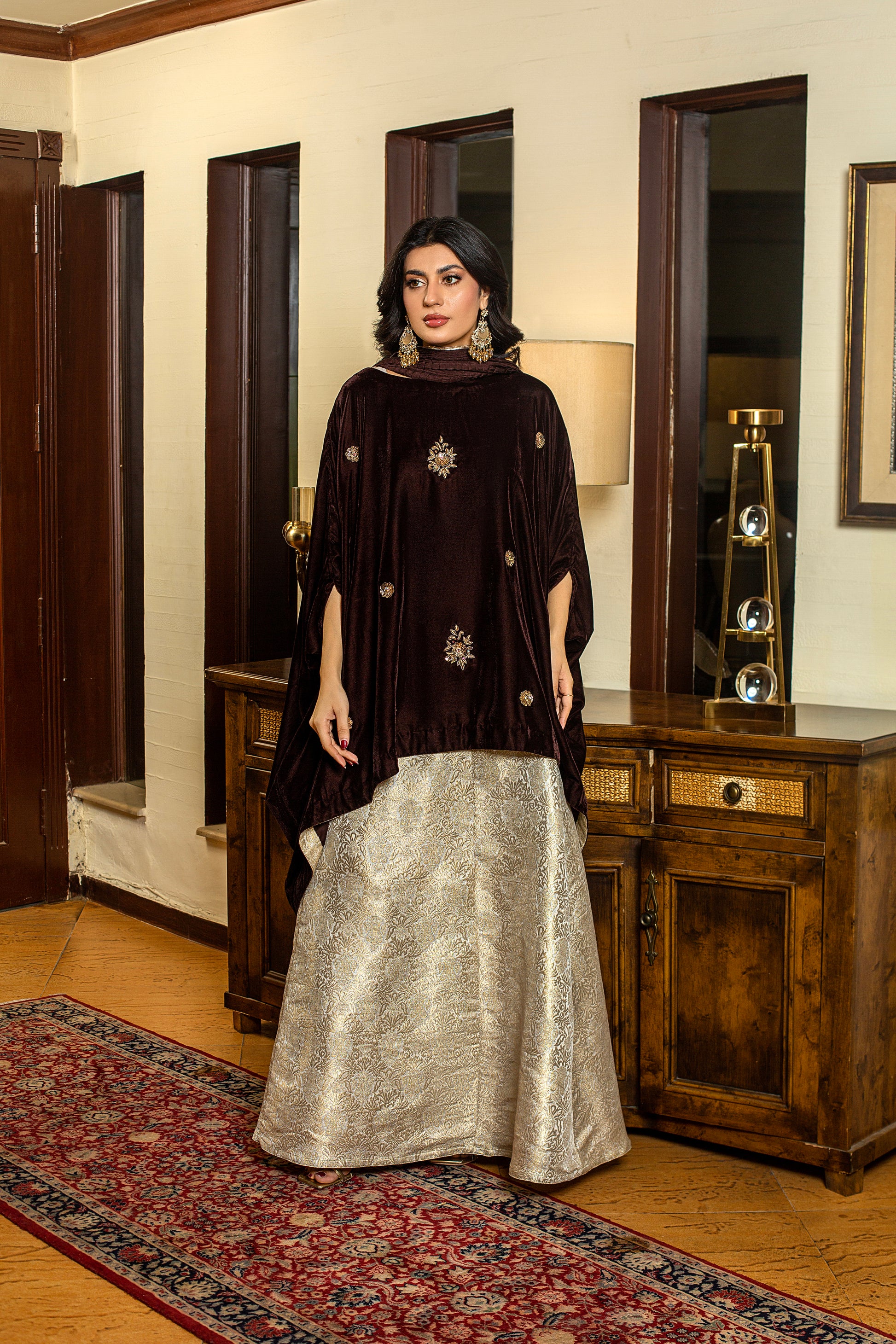 Marigold is a brown velvet short baggy shirt adorned with intricate dabka, tilla, and sequins embellishments, creating a rich and timeless festive look. Trouser or Lehnga can be added seperately.