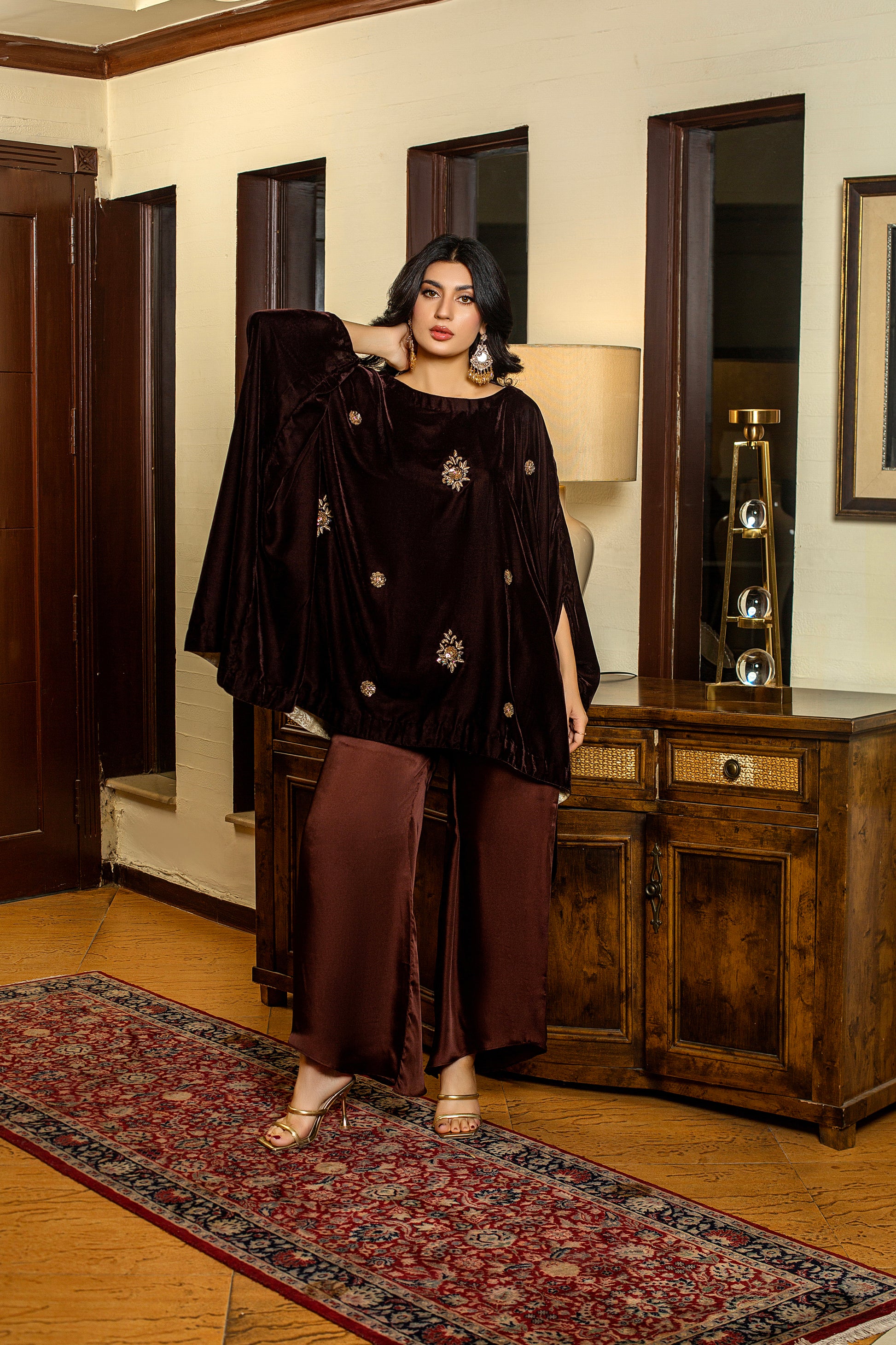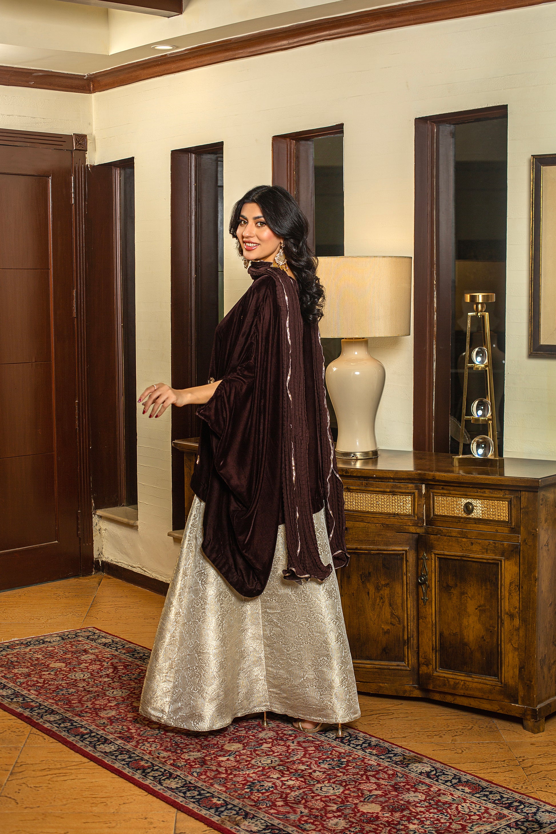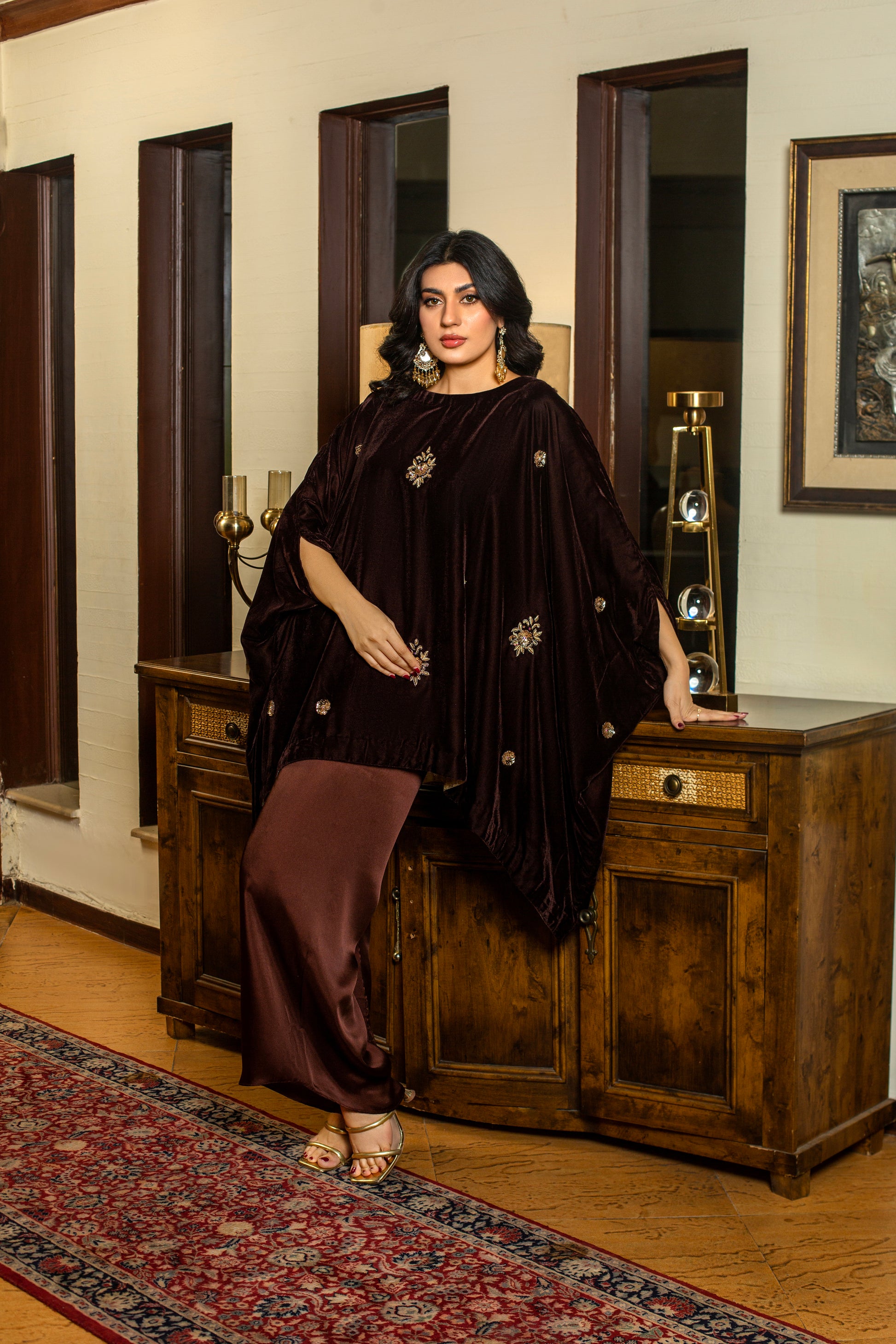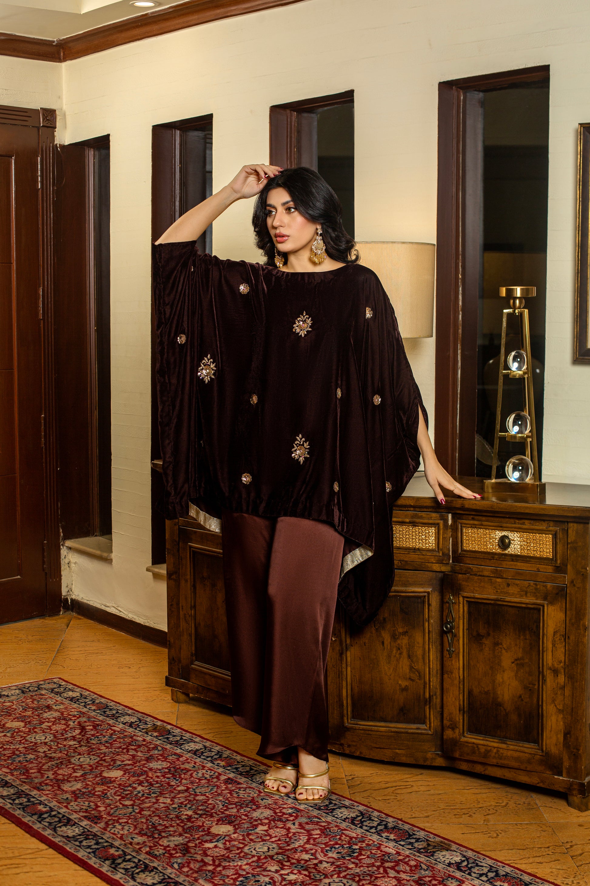 Marigold is a brown velvet short baggy shirt adorned with intricate dabka, tilla, and sequins embellishments, creating a rich and timeless festive look. Trouser or Lehnga can be added seperately.