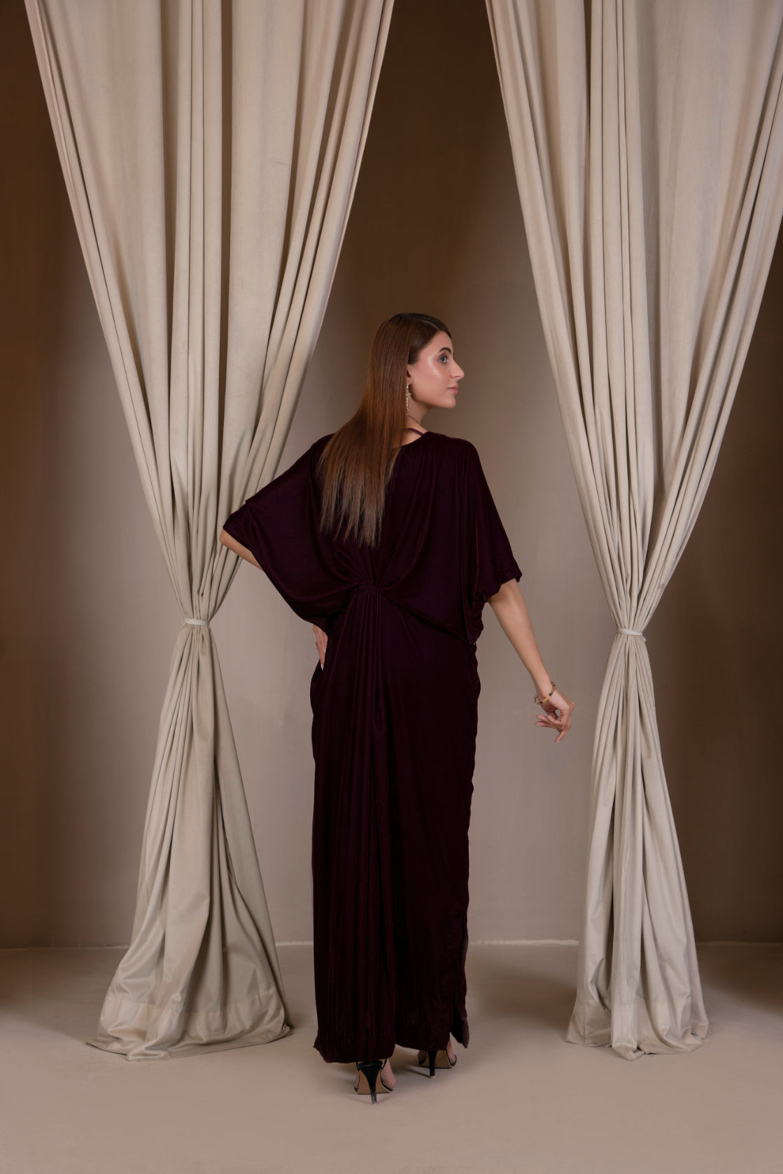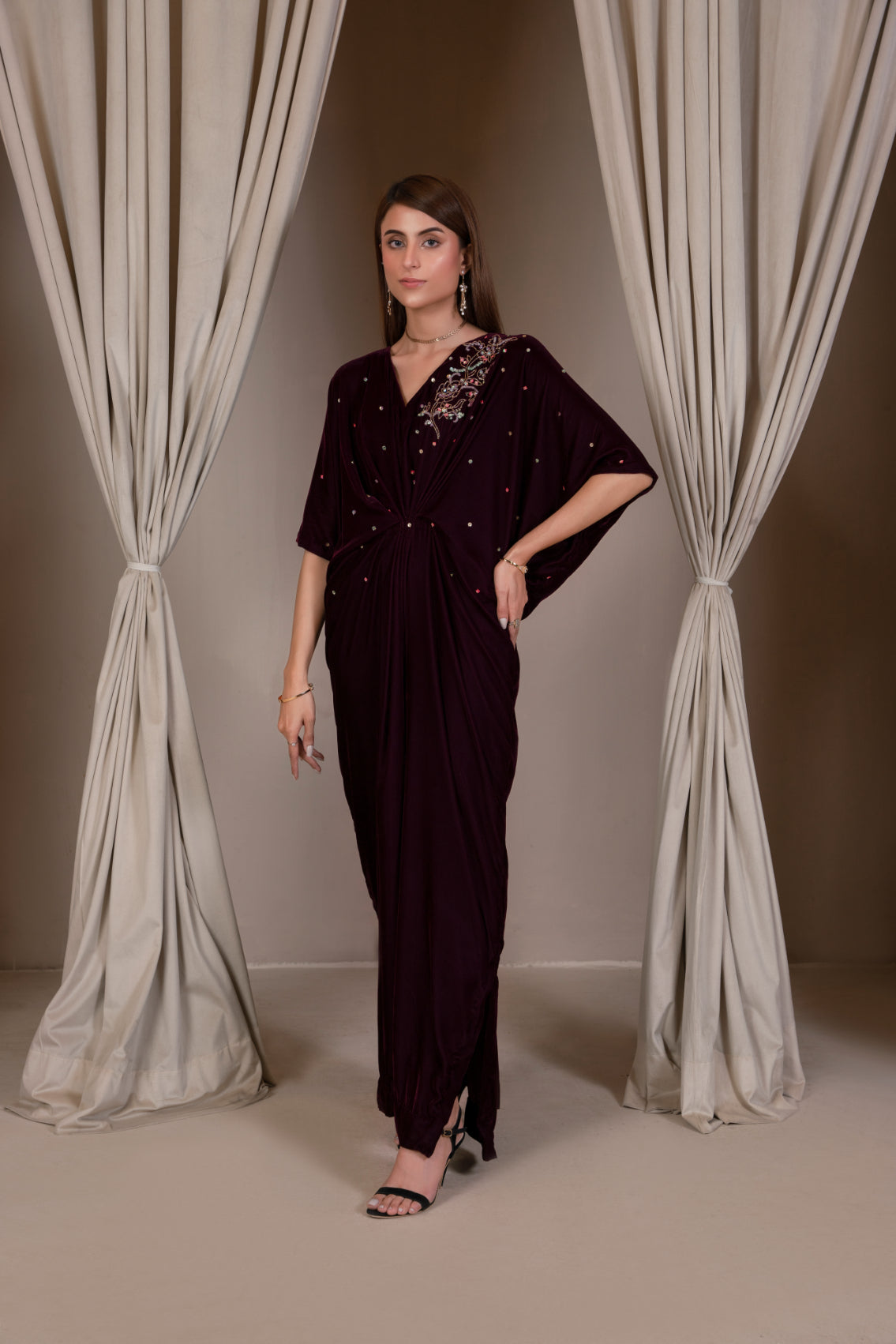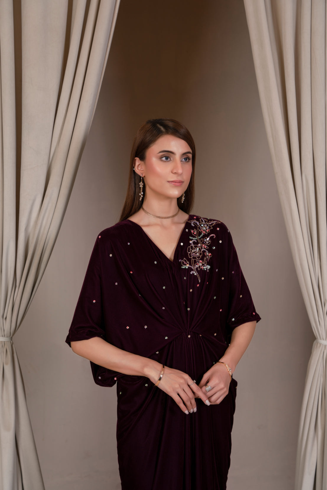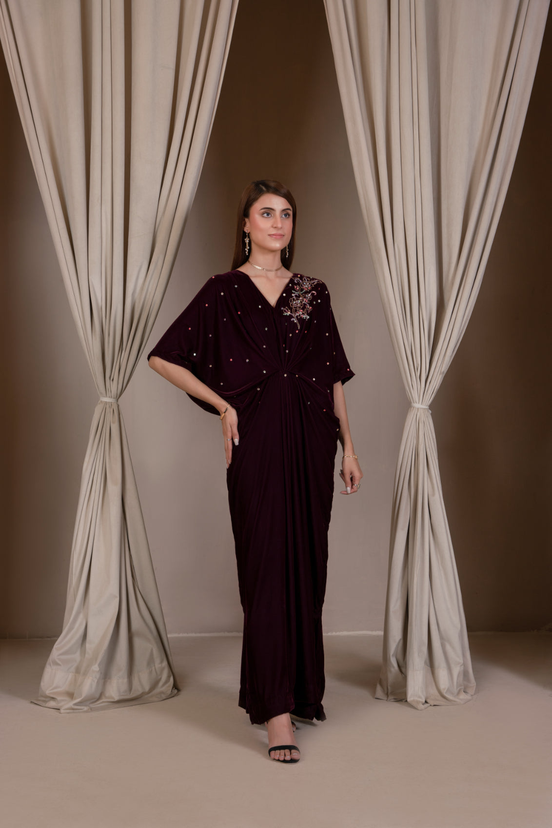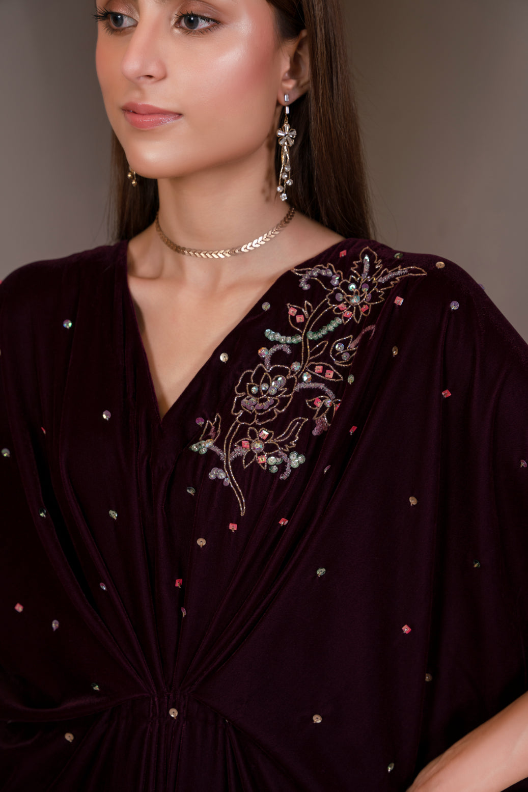 Elevate your style with this exqusite teal blue velvet kaftan is opulently curated with elegant embroidery which enhance its beauty and embellished with crystals, pearls and swaroski on shoulders and front which gives you a perfect look.