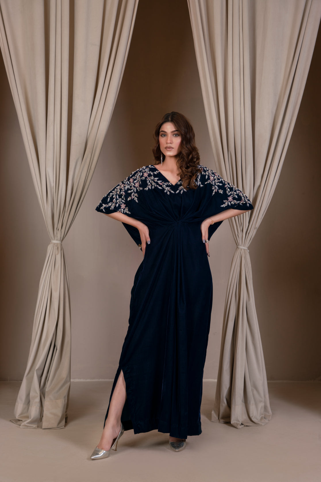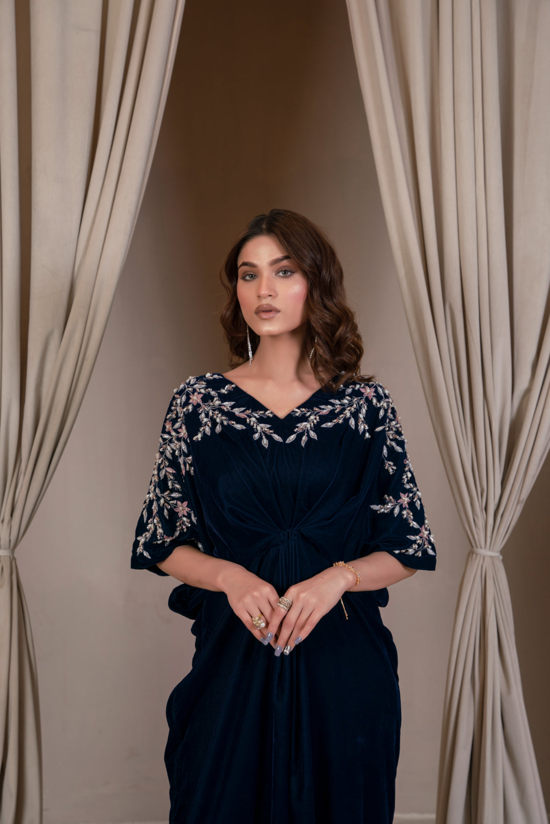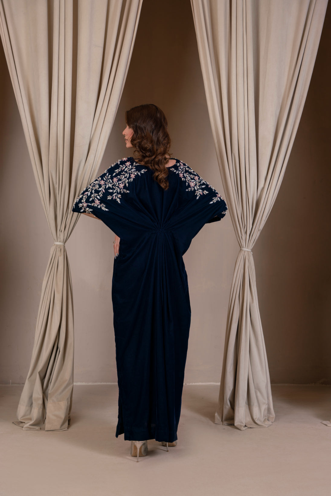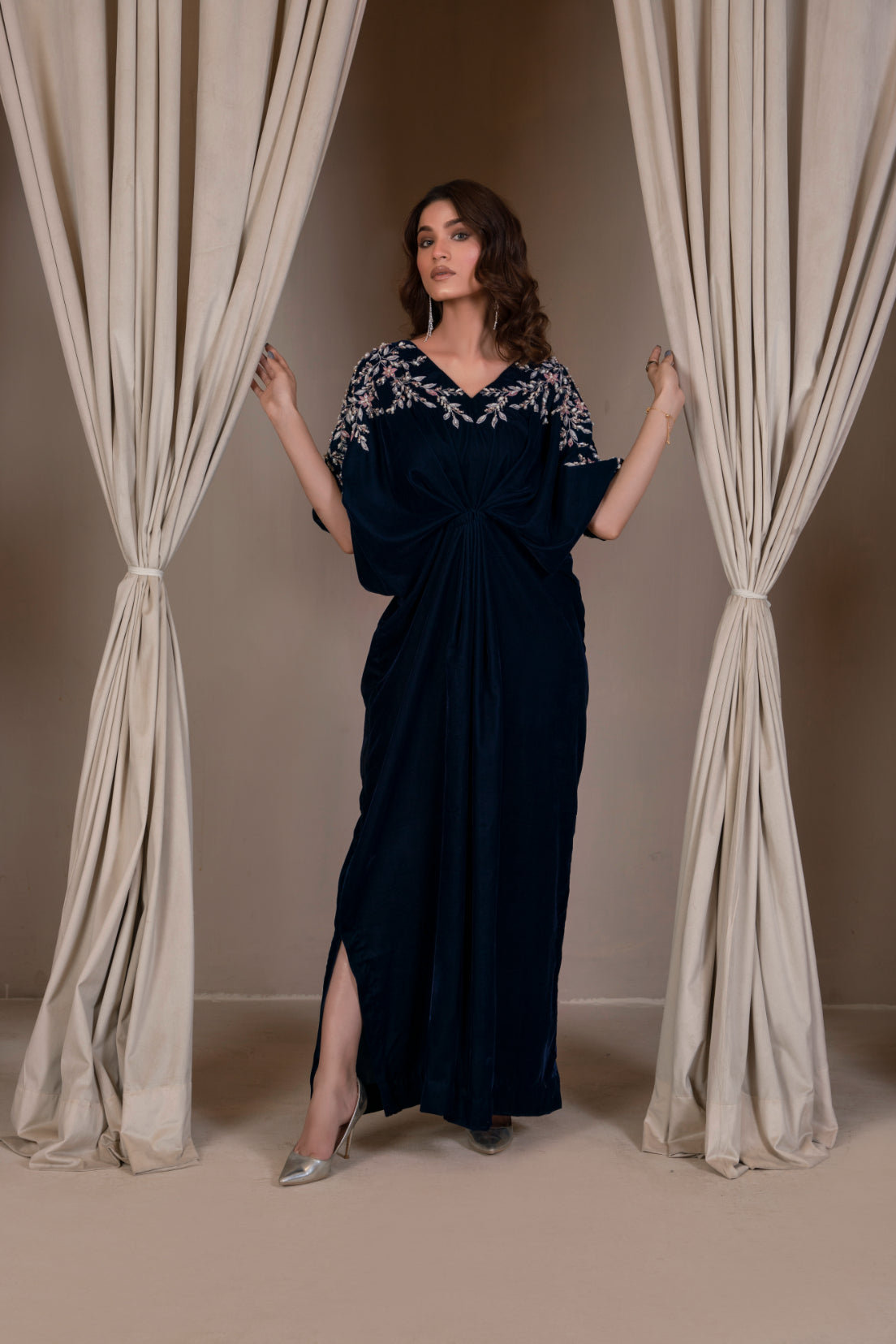 Elevate your style with this exqusite teal blue velvet kaftan is opulently curated with elegant embroidery which enhance its beauty and embellished with crystals, pearls and swaroski on shoulders and front which gives you a perfect look.