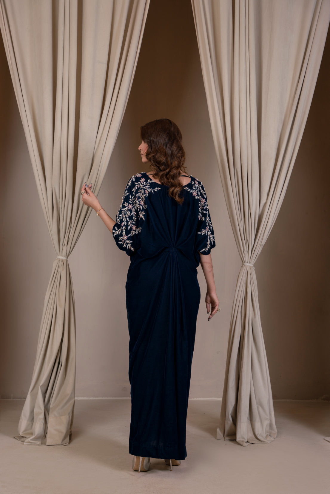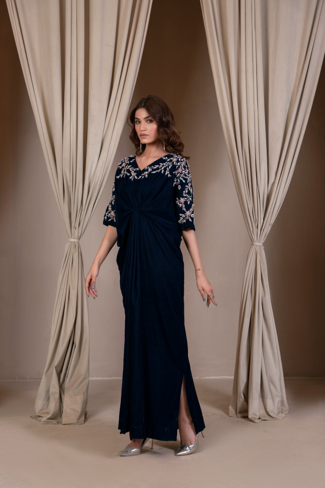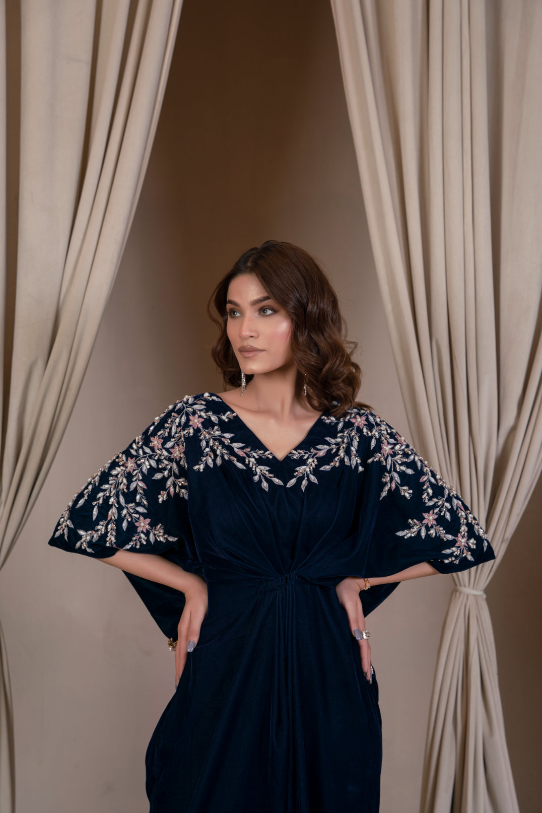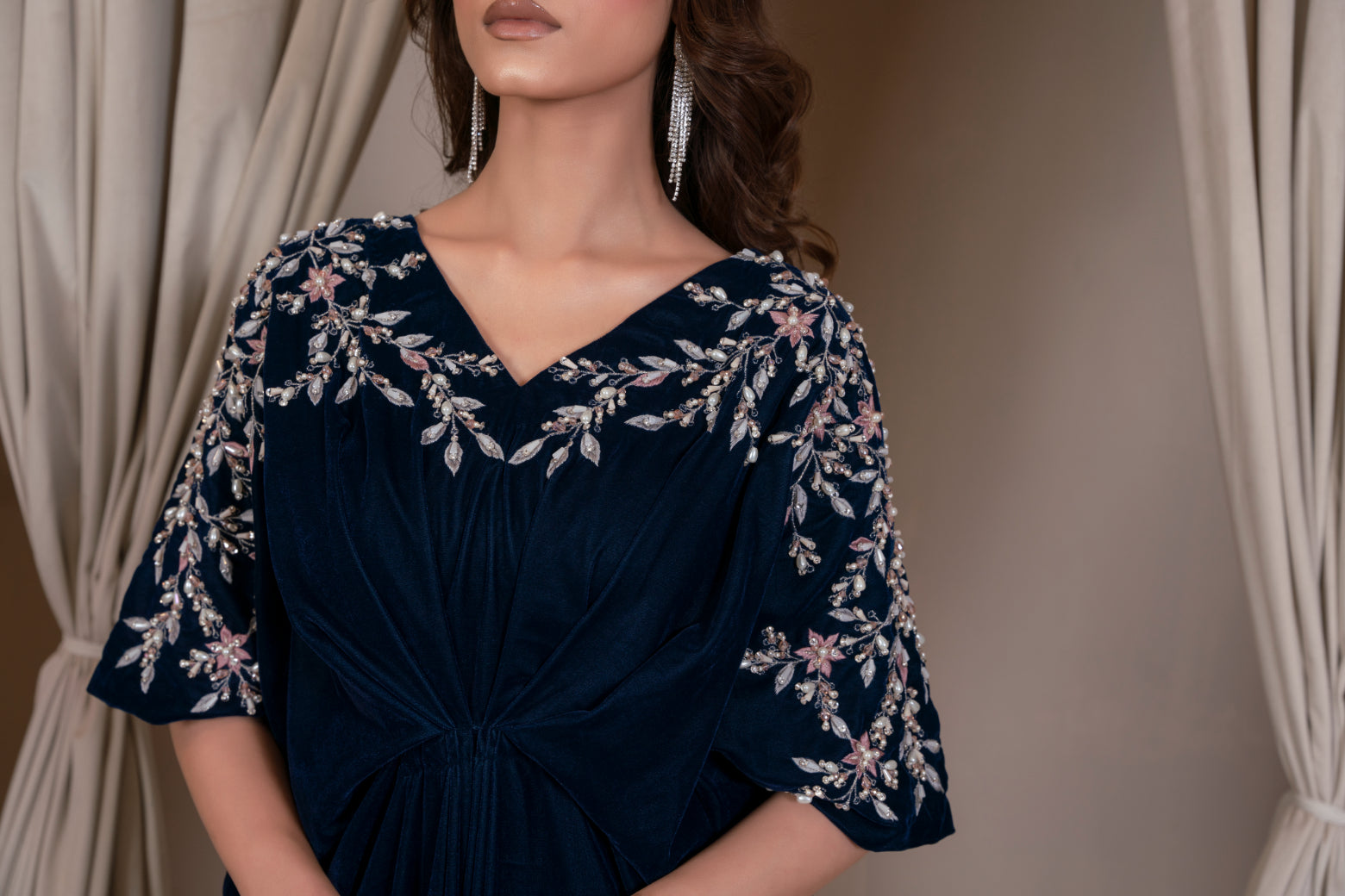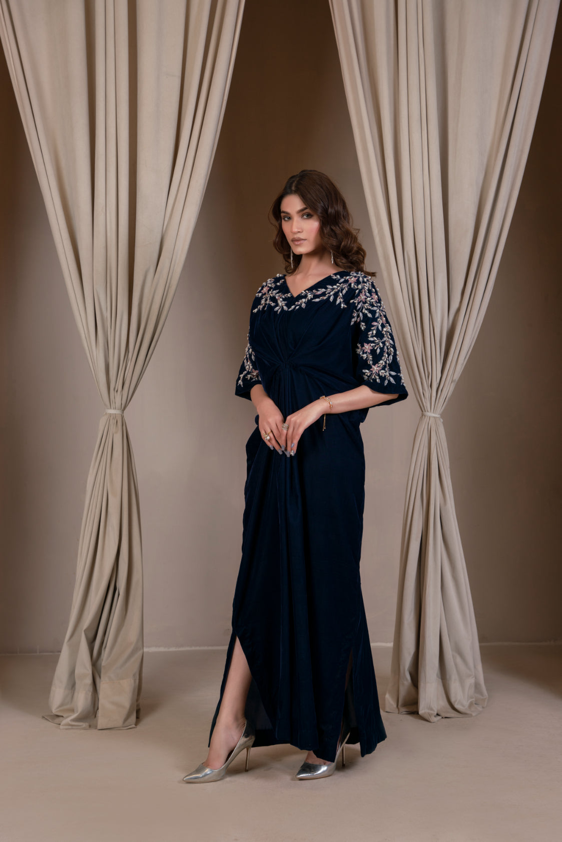 Elevate your style with this exqusite teal blue velvet kaftan is opulently curated with elegant embroidery which enhance its beauty and embellished with crystals, pearls and swaroski on shoulders and front which gives you a perfect look.