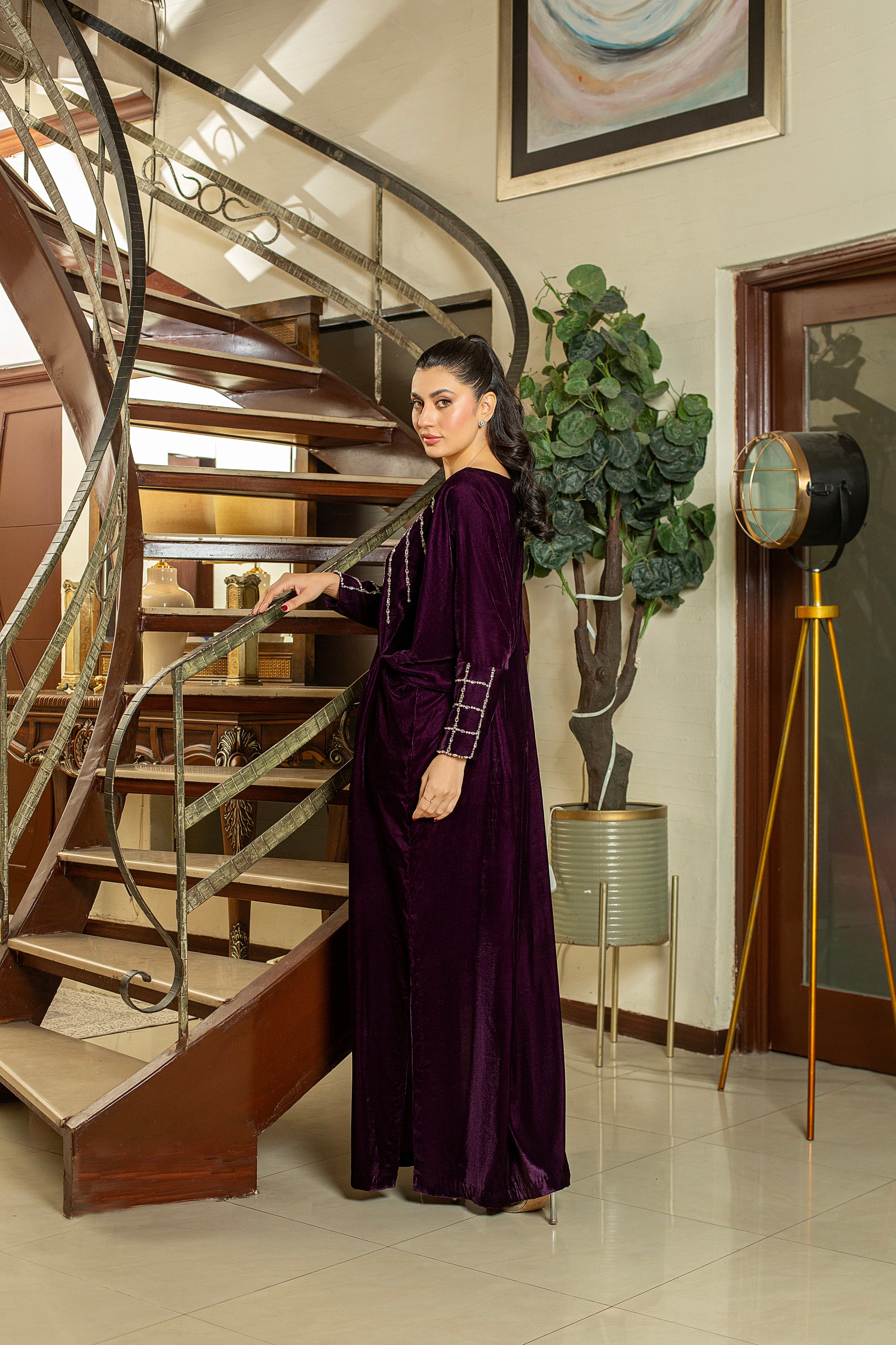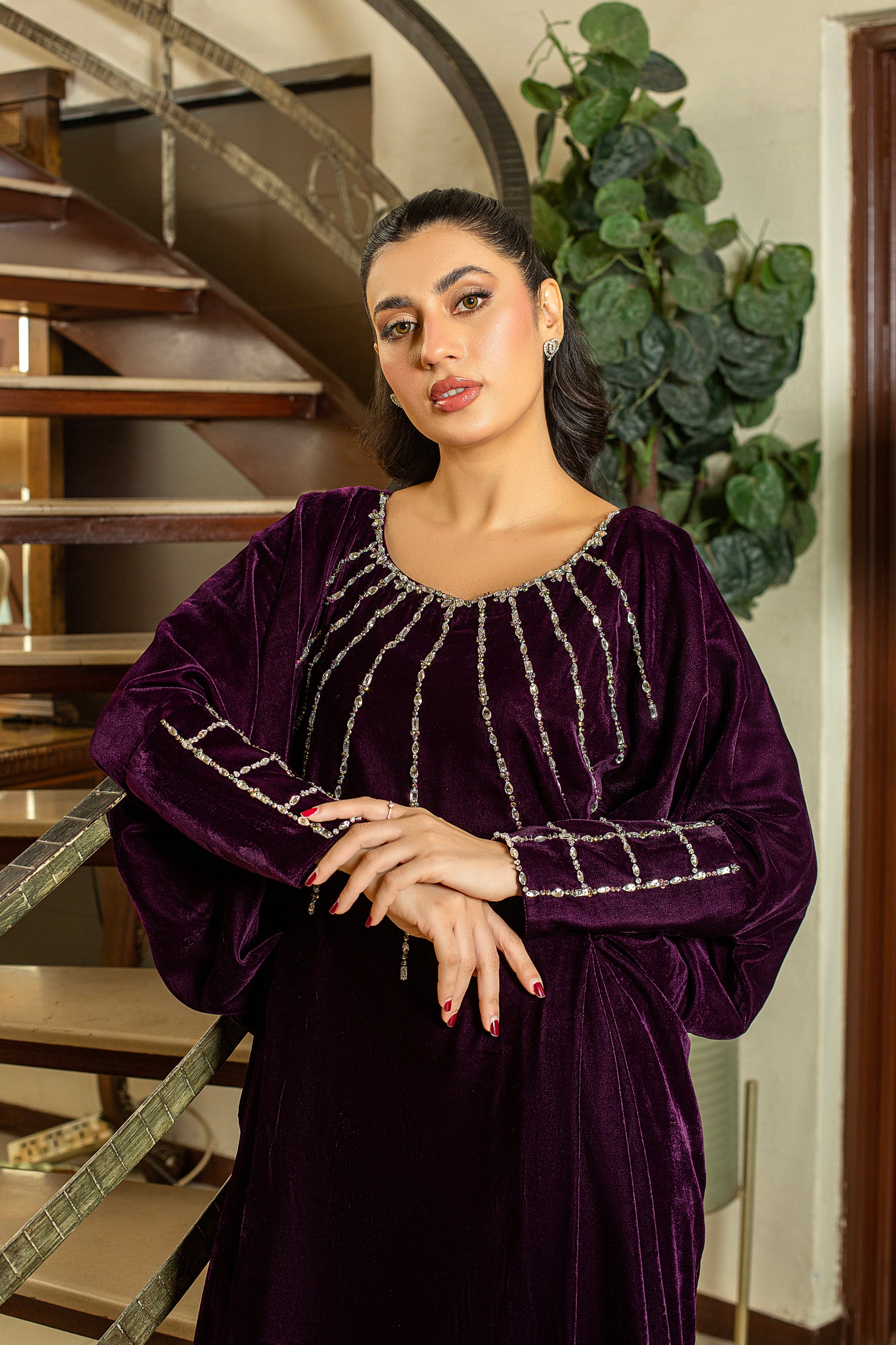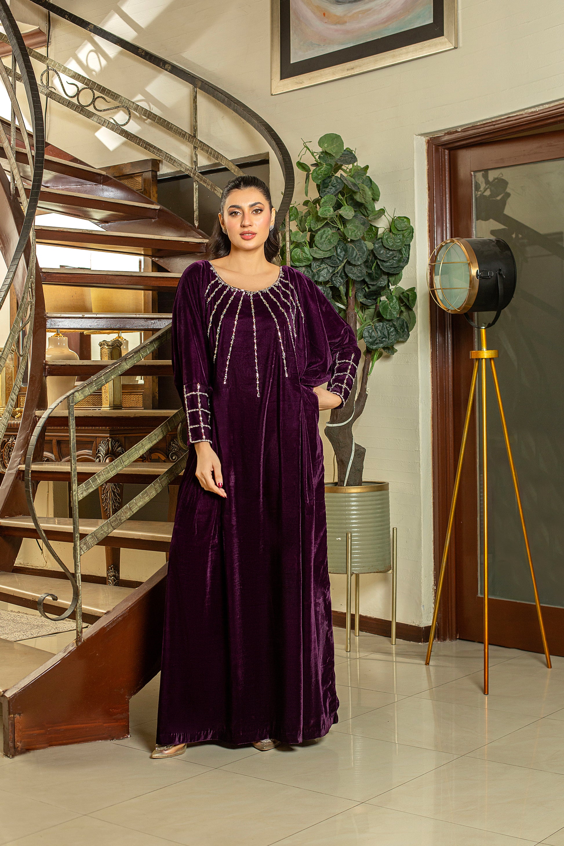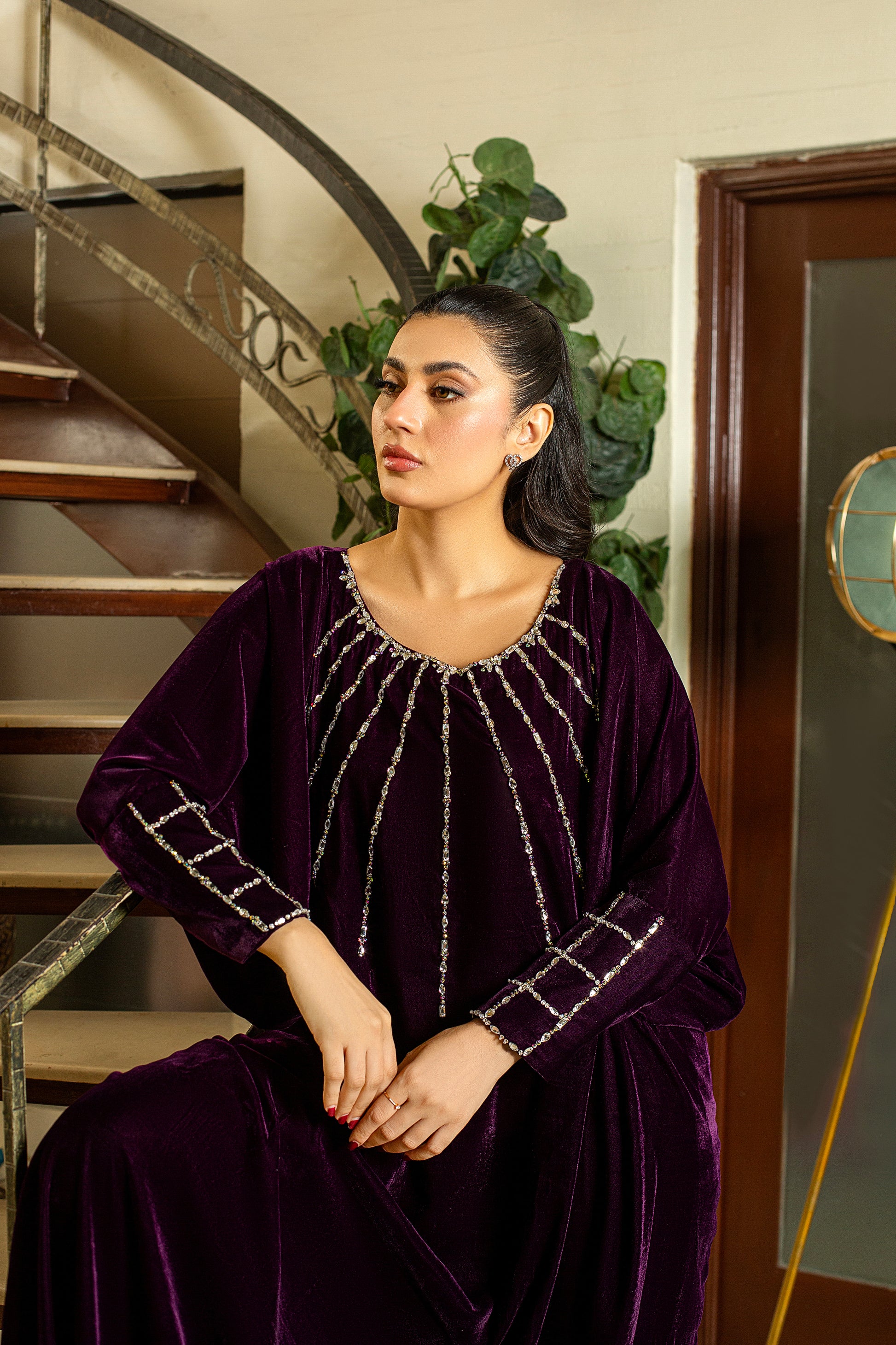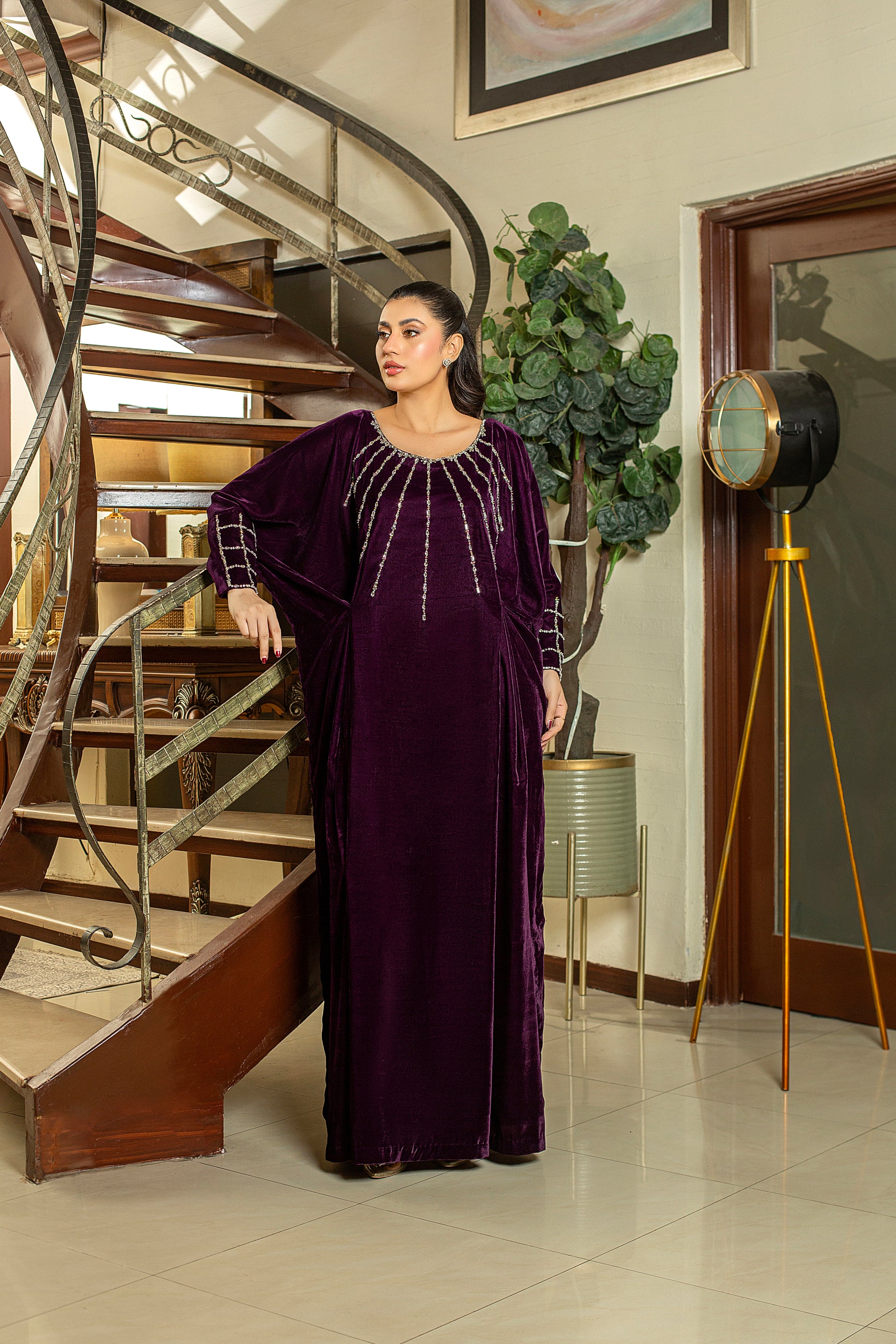 Orchid is a plum kaftan exquisitely adorned with Swarovski and stonework on the neckline and cuff sleeves, offering a sophisticated and effortlessly perfect look.