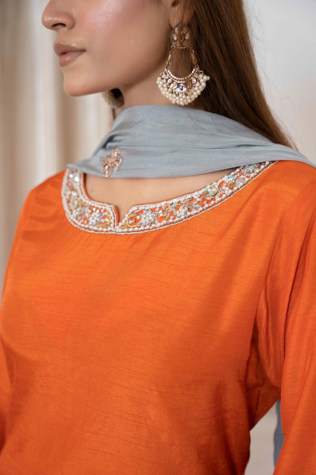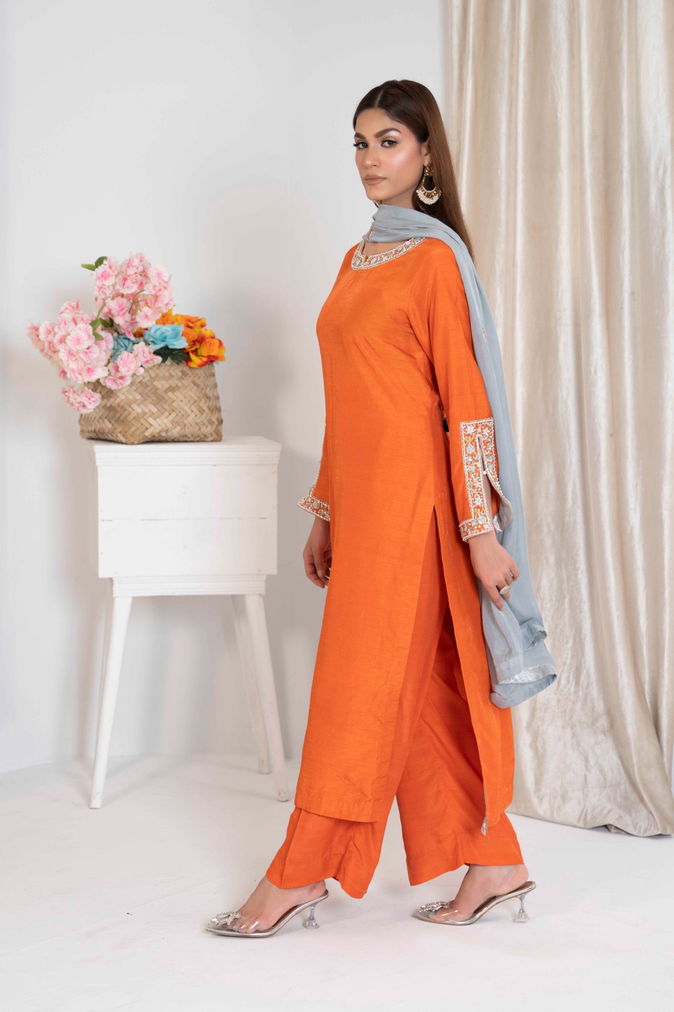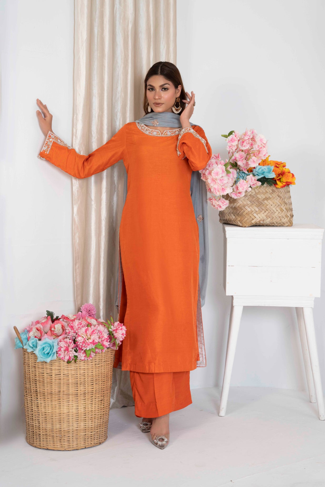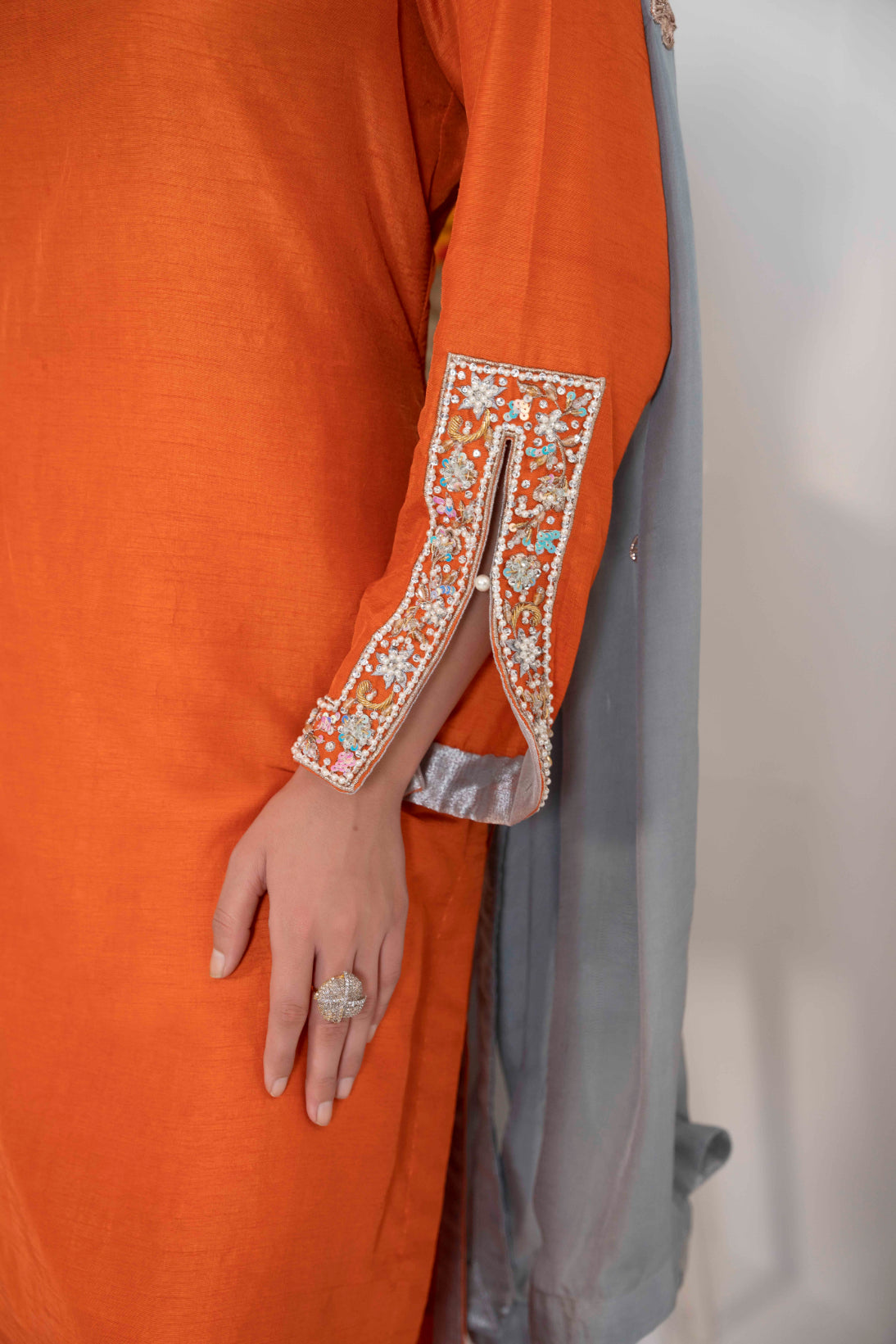 Contemporary yet classic, Rushna is a beautiful ensemble with delicately curated sleeves and neckline with traditional embroidery and adda work included with embroidered silk dupatta and trousers.