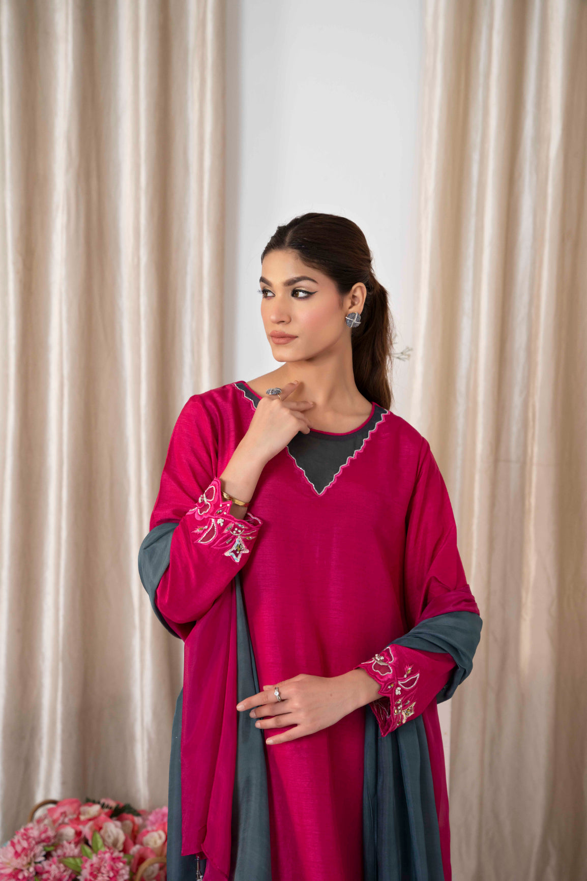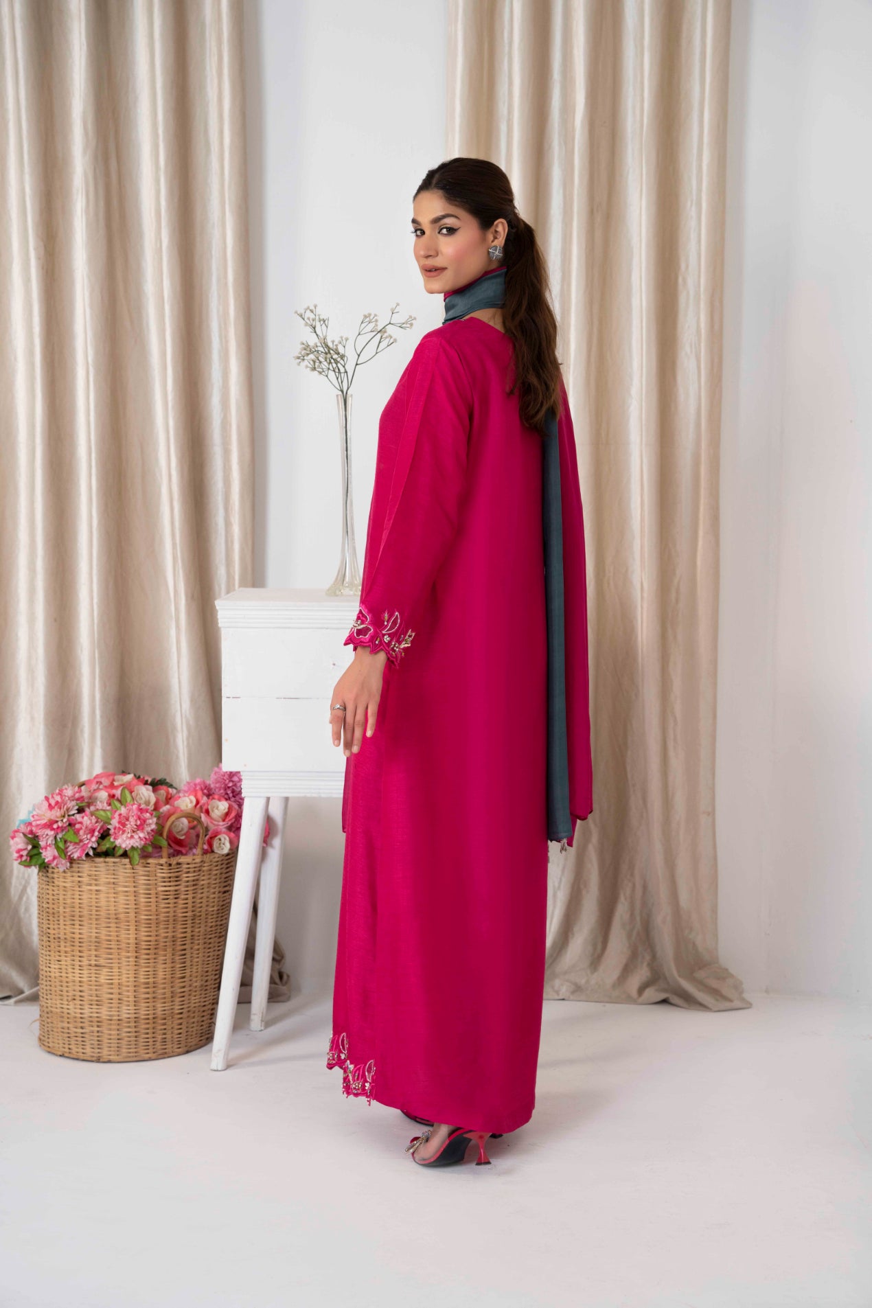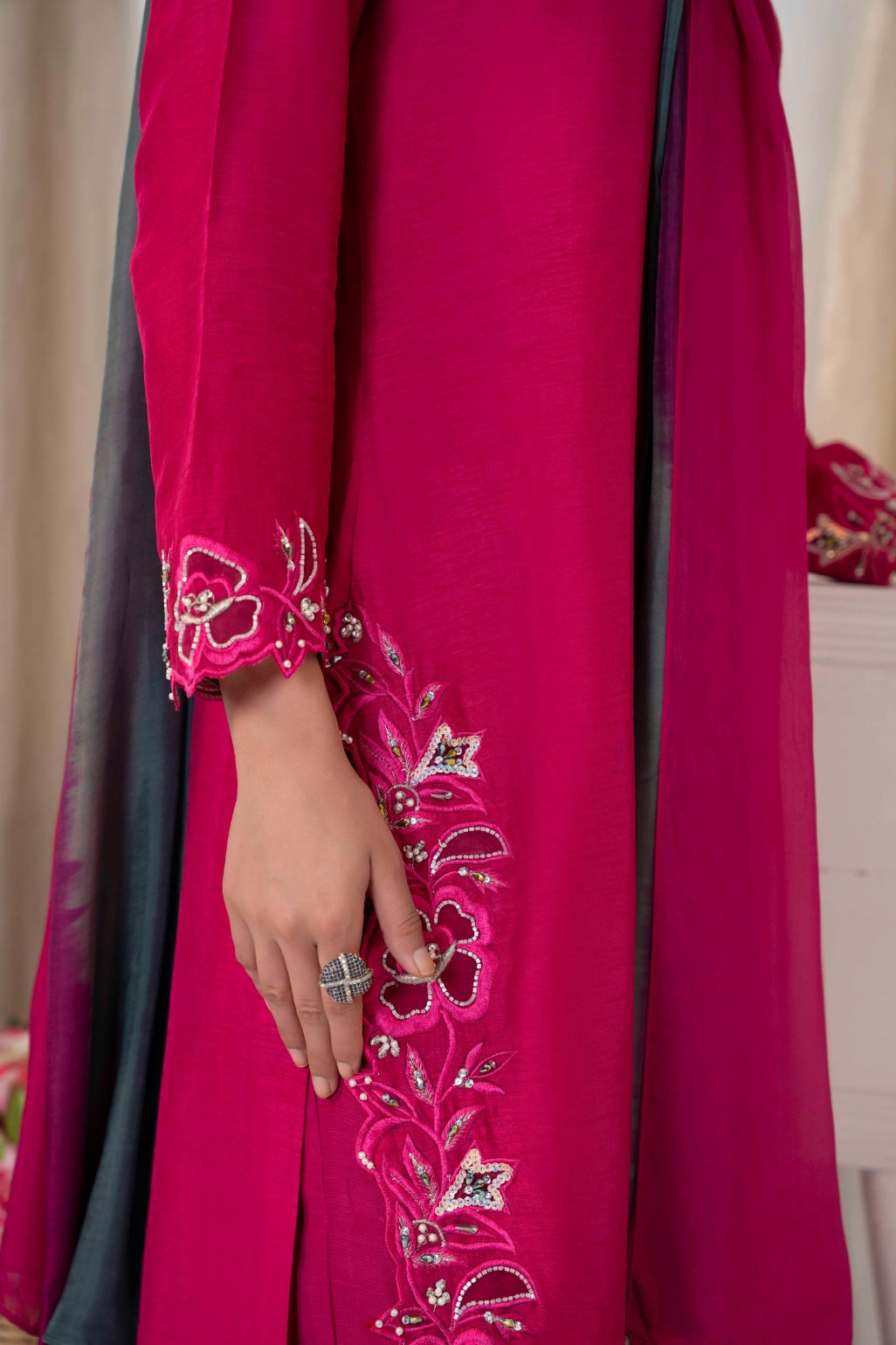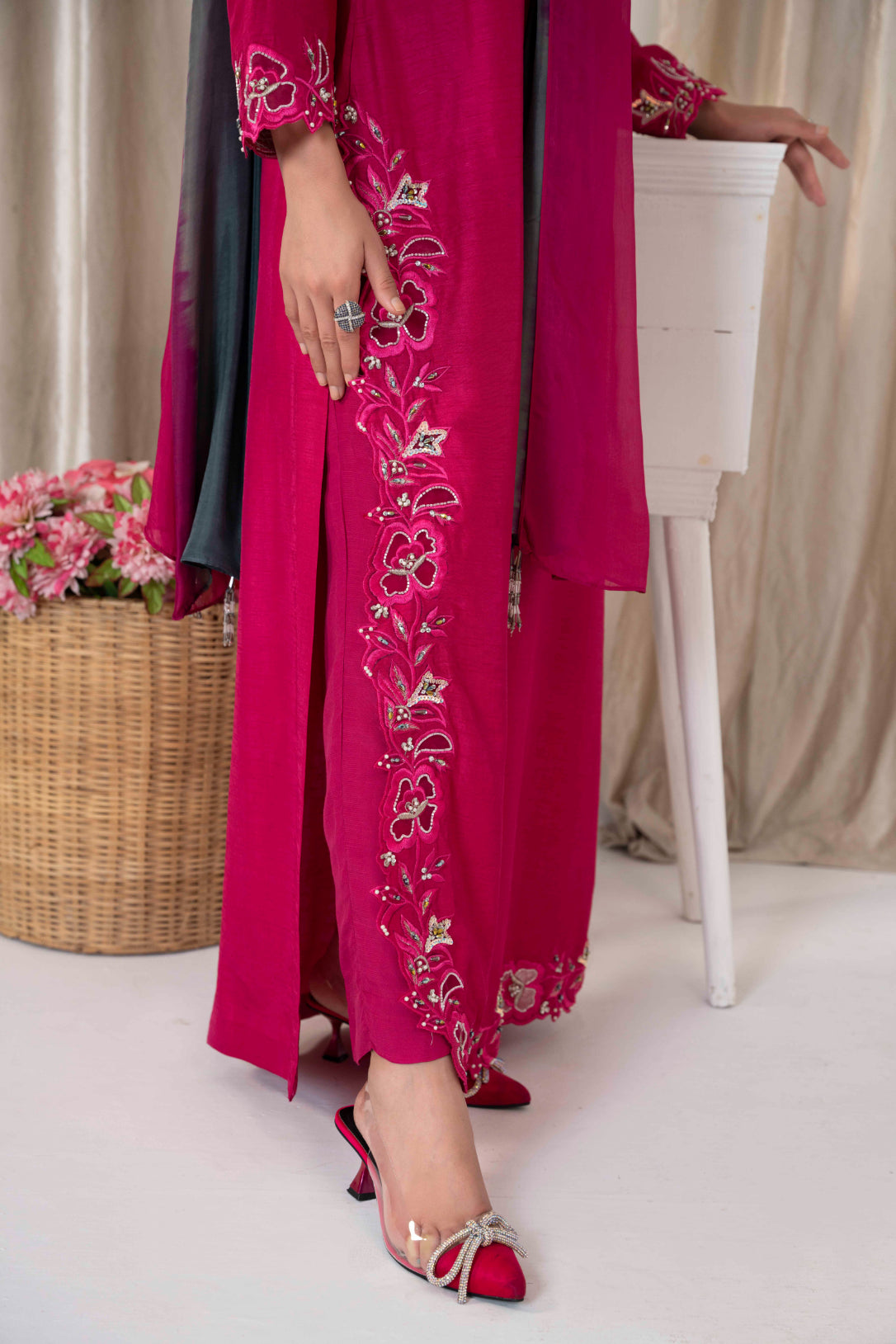 Prepare to captivate in our shocking pink ensemble! A straight, long shirt crafted from luxurious semi pure Korean silk boasts a modern allure with full hand embellishments, promising to dazzle with every step. Paired seamlessly with cigarette trousers for a chic silhouette, and adorned with two tone silk dupatta.