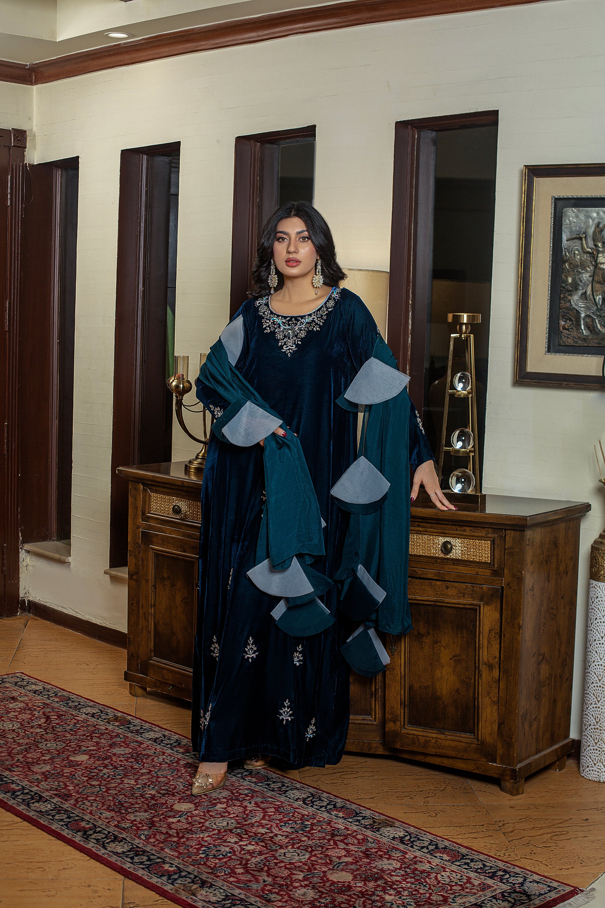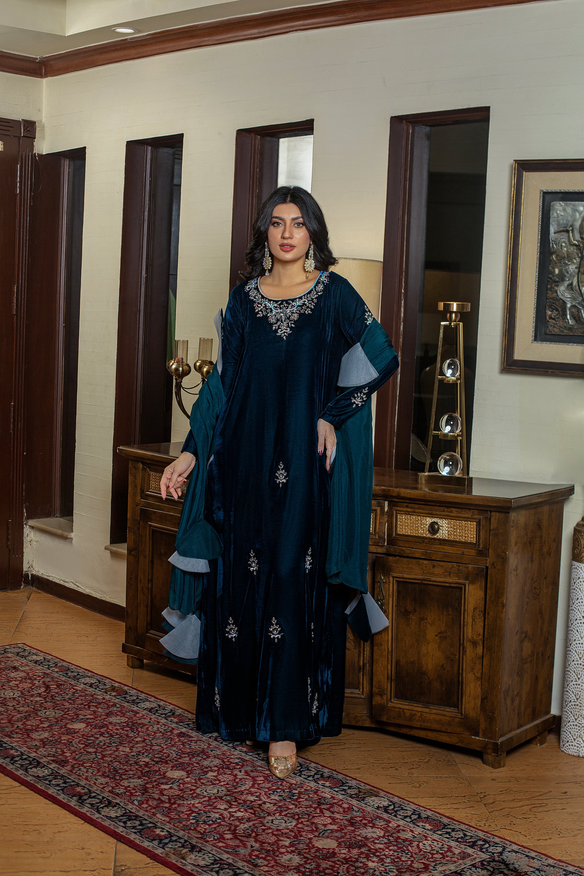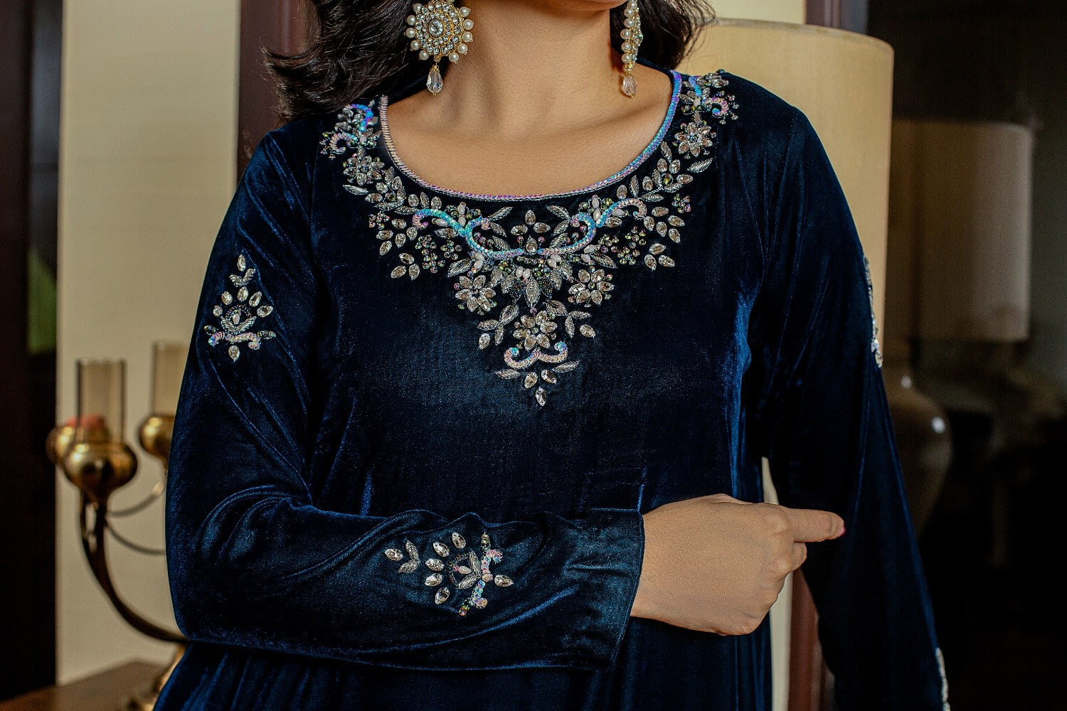 Elevate your style with this teal velvet outfit, featuring a meticulously hand-embellished neckline and hemline adorned with naqshi, dabka, and Swarovski detailing.
