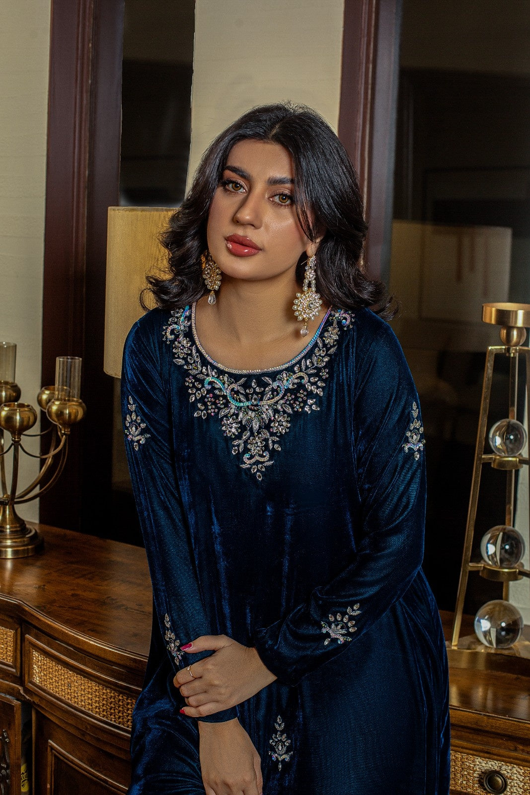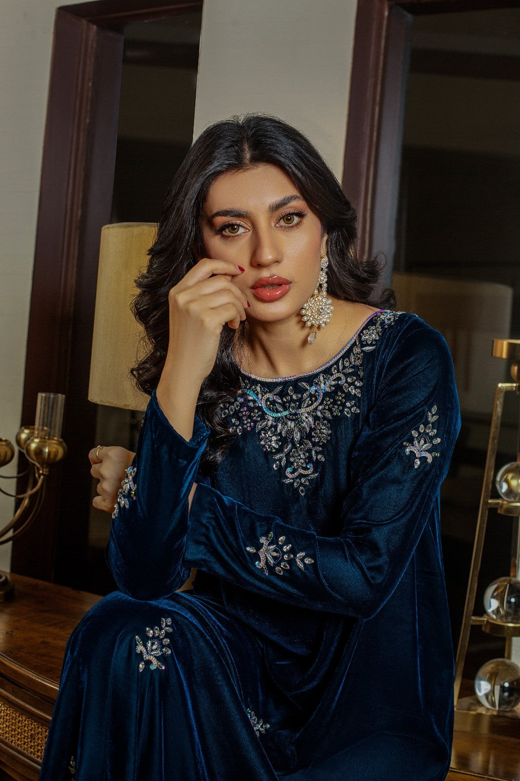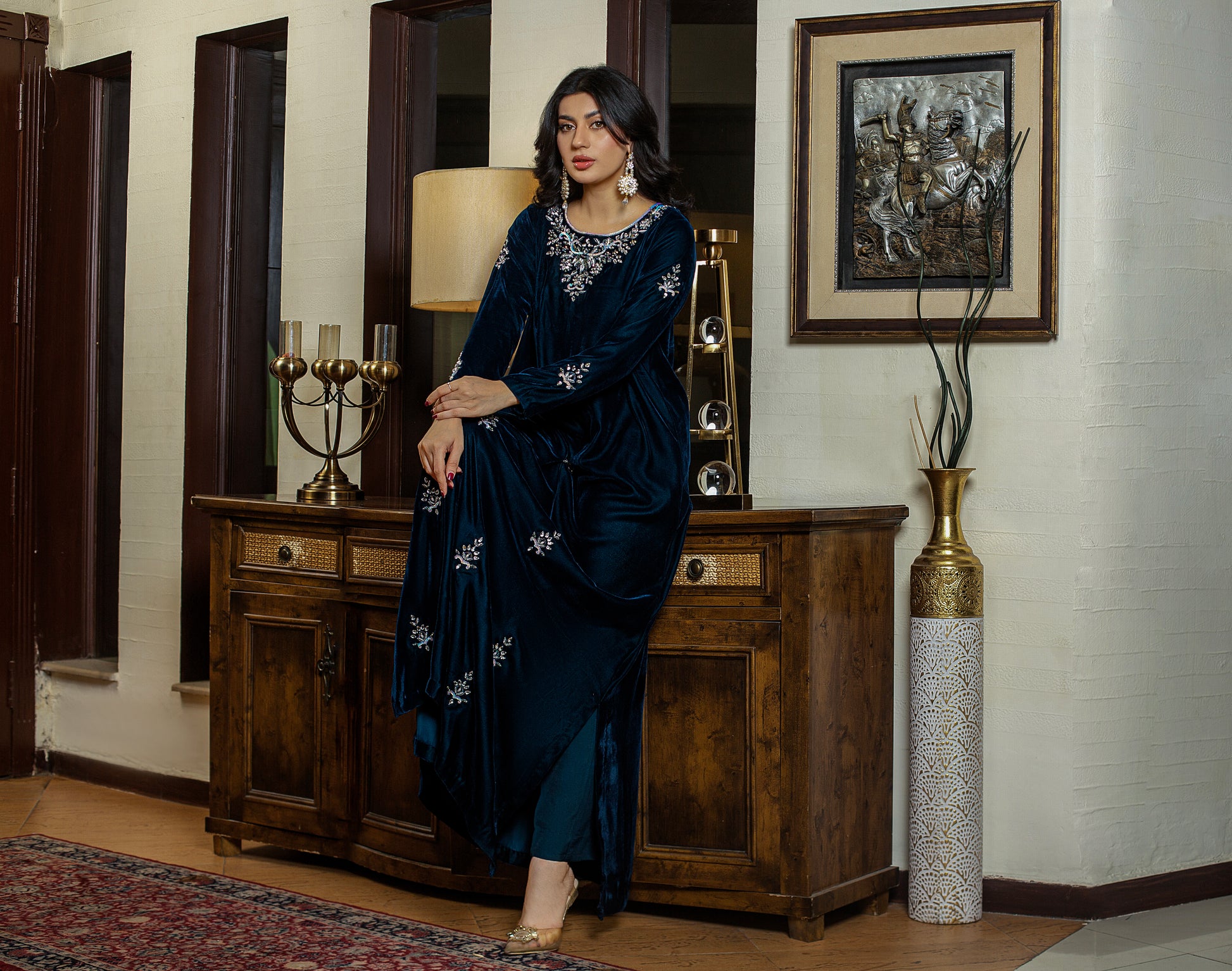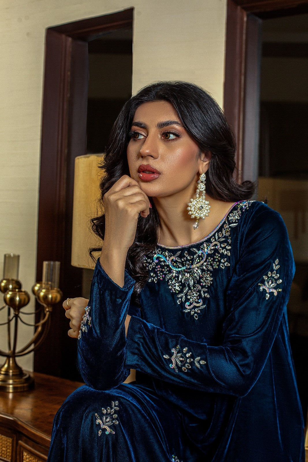Elevate your style with this teal velvet outfit, featuring a meticulously hand-embellished neckline and hemline adorned with naqshi, dabka, and Swarovski detailing.